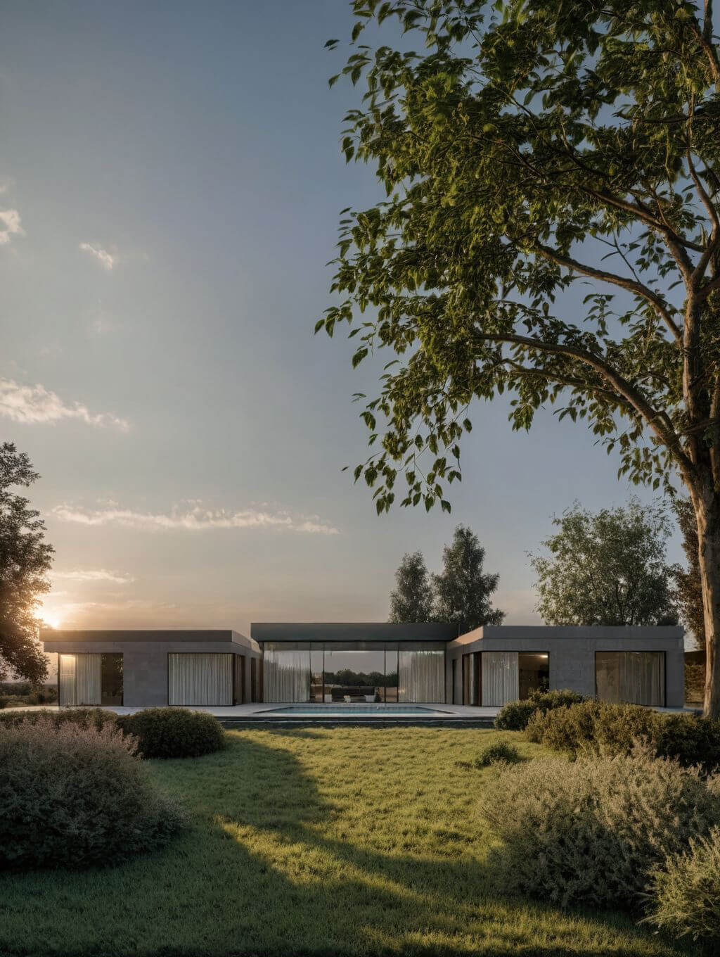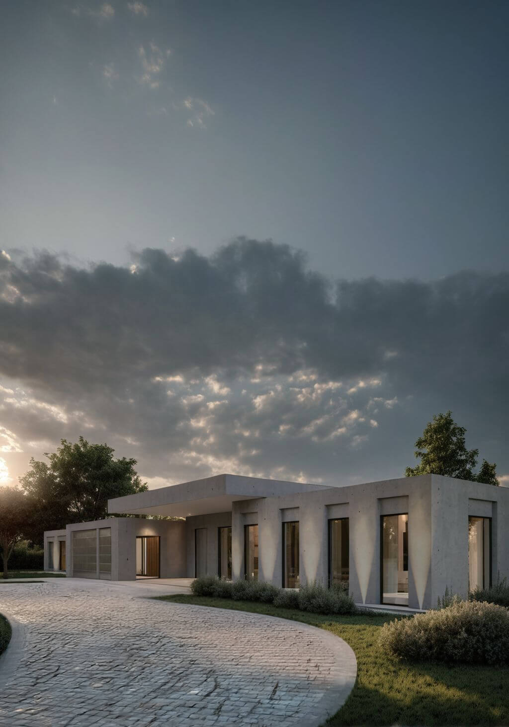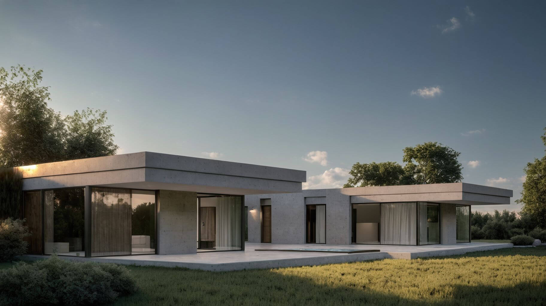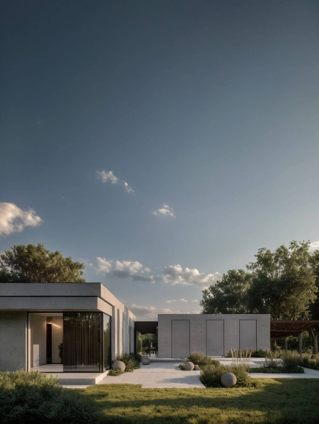 Projekt rezydencji to współczesna interpretacja modernistycznej architektury, gdzie minimalistyczna forma spotyka się z wyrafinowaną elegancją. Bryła budynku została skomponowana z połączonych kubicznych modułów o płaskich dachach, tworząc dynamiczną, horyzontalną kompozycję doskonale wpisującą się w naturalny krajobraz. Elewacja wykończona hiszpańskim wapieniem nadaje budowli szlachetny, ponadczasowy charakter, gdzie naturalna faktura kamienia subtelnie współgra z wielkopowierzchniowymi przeszkleniami.